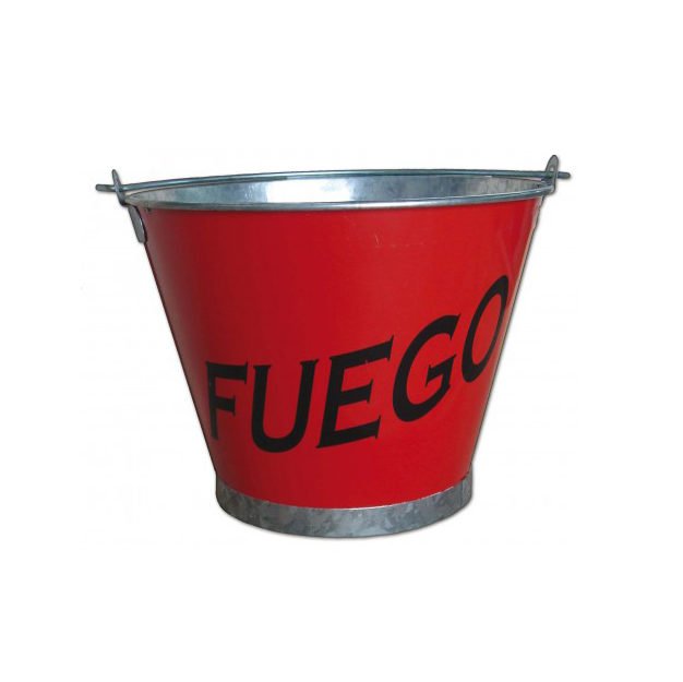 Balde de acero galvanizado de color rojo con la palabra “Fuego” pintada en negro.