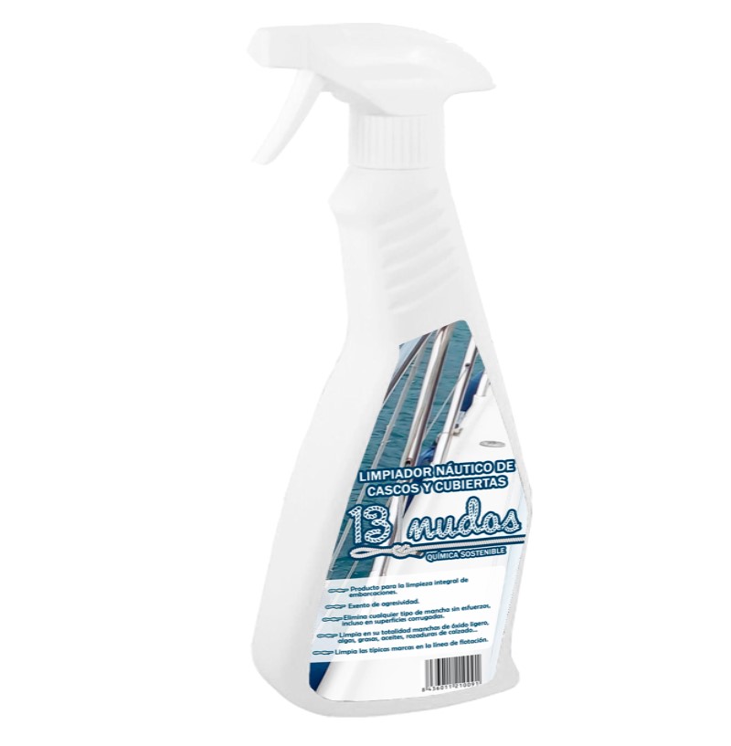 13 NUDOS es un limpiador náutico formulado para la limpieza integral de cascos y cubiertas. Limpia de forma eficaz manchas de algas, aceites, rozaduras, etc.