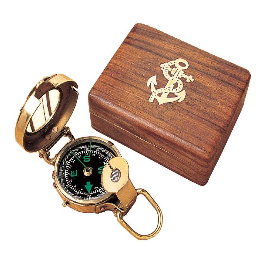 Brújula “Engineering” en latón con su caja de madera de acacia decorada de un ancla.