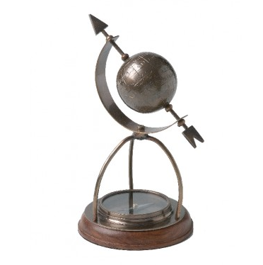 Original brújula en latón envejecido sobre la cual se erige un globo terrestre