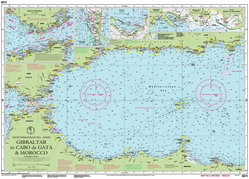 En En esta edición de 2018, la especificación de la tabla se ha mejorado para mostrar destellos de luz de colores. Se incluyen los desarrollos portuarios continuos en Gibraltar y los desarrollos portuarios completados en Almería. Se han actualizado las reservas marinas.