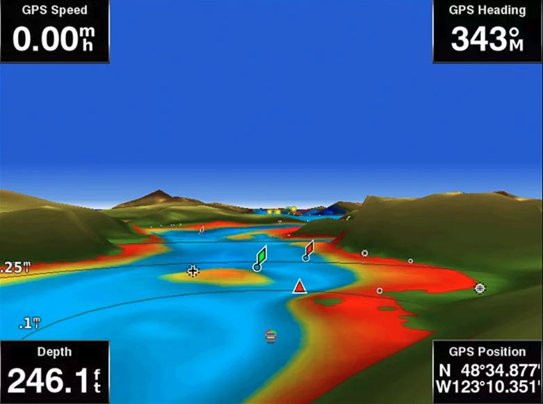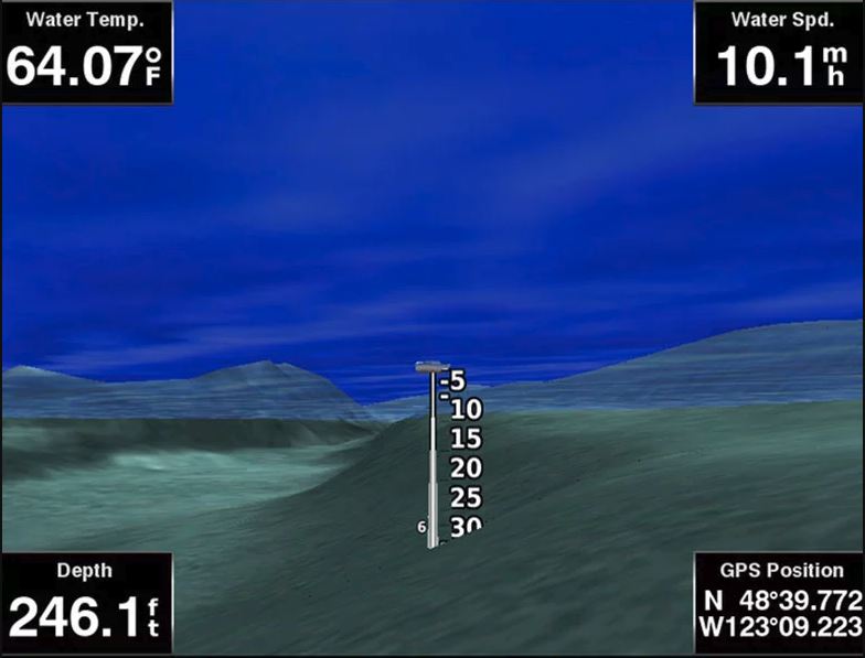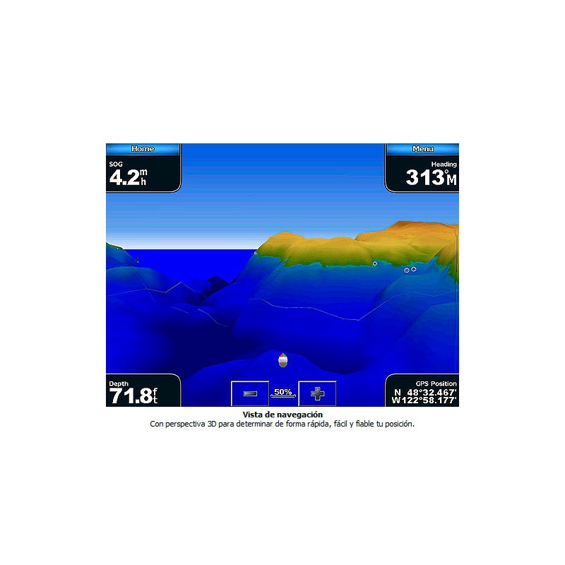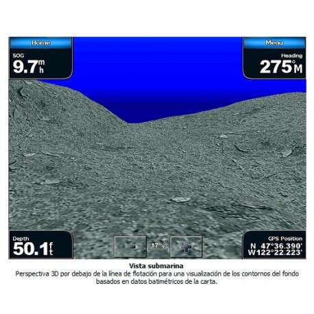 Esta perspectiva submarina muestra una representación en 3D del fondo y los contornos según se ven desde debajo de la línea de flotación. Interfaz con datos de sonda para una vista personalizada.