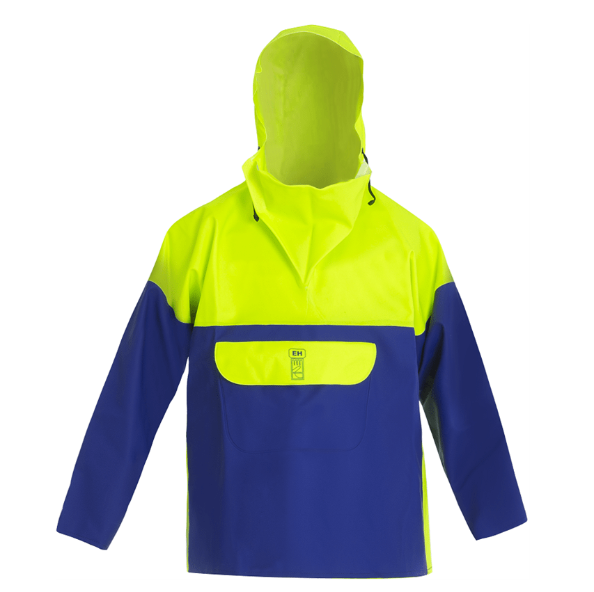 capucha con visera, costuras soldadas para mayor resistencia (100% a prueba de agua), fabricado de PVC reforzado para una resistencia añadida.