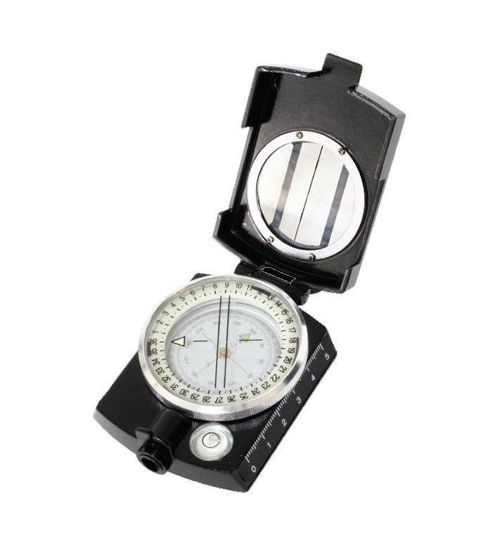 Brújula metálica de precisión, en color negro, con linea de rumbo y lectura aumentada.