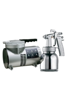 Pistola presurizada con boquilla de mezcla interna que permite trabajar con un bajísimo consumo -sólo 65 L/min- y muy baja presión -1-2 bar-.