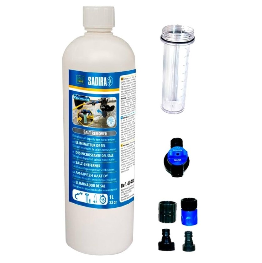 – Motor: Hacer circular una disolución de 200 a 500 ml de Eliminador de Sal en 10 litros de agua dulce por el circuito de refrigeración durante 5 a 15 minutos, bien sumergiendo la cola del motor en un recipiente plástico con la mezcla, bien conectando una manguera a los orificios de entrada del agua mediante unas orejeras y graduando la mezcla con un envase mezclador/dosificador intercalado.