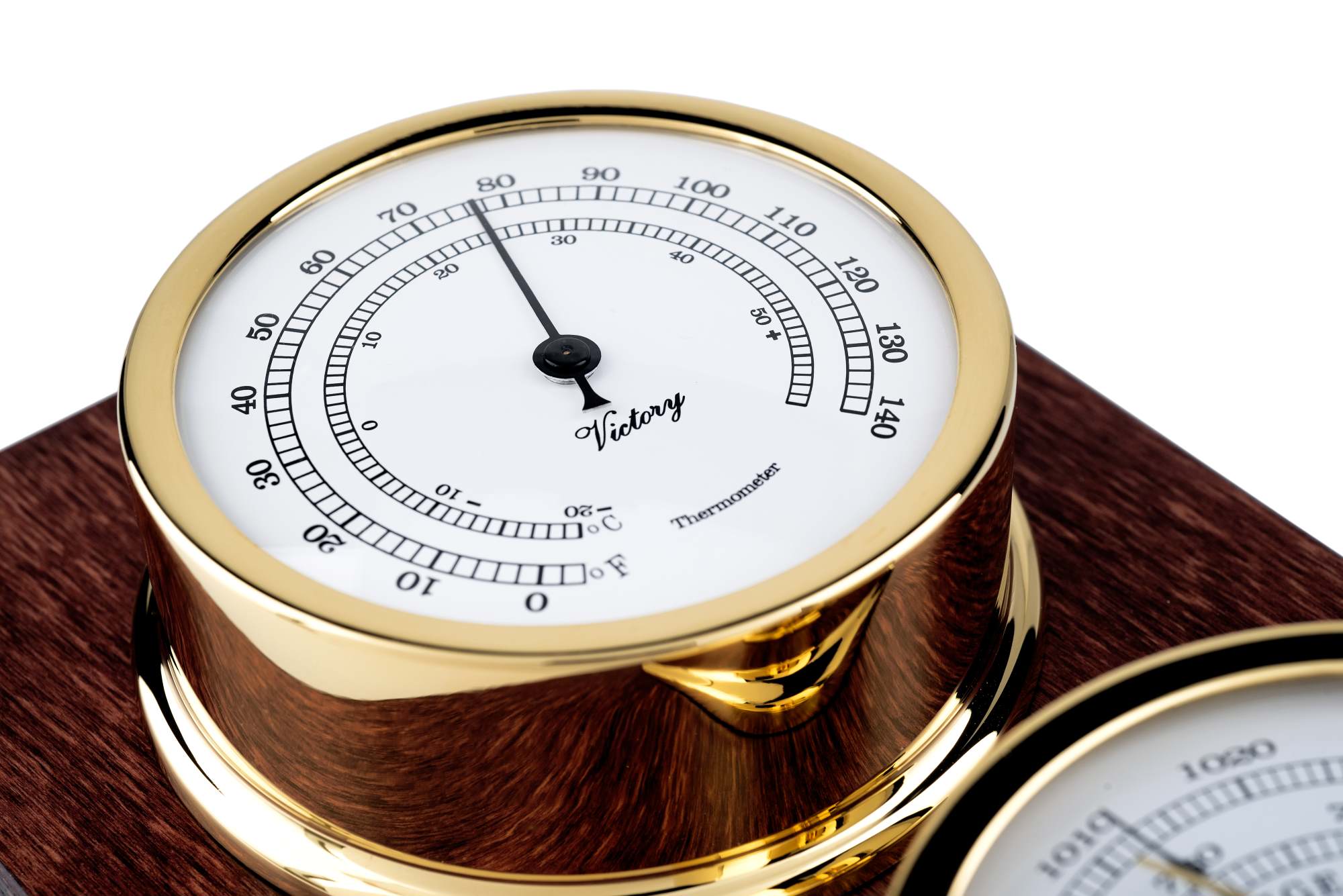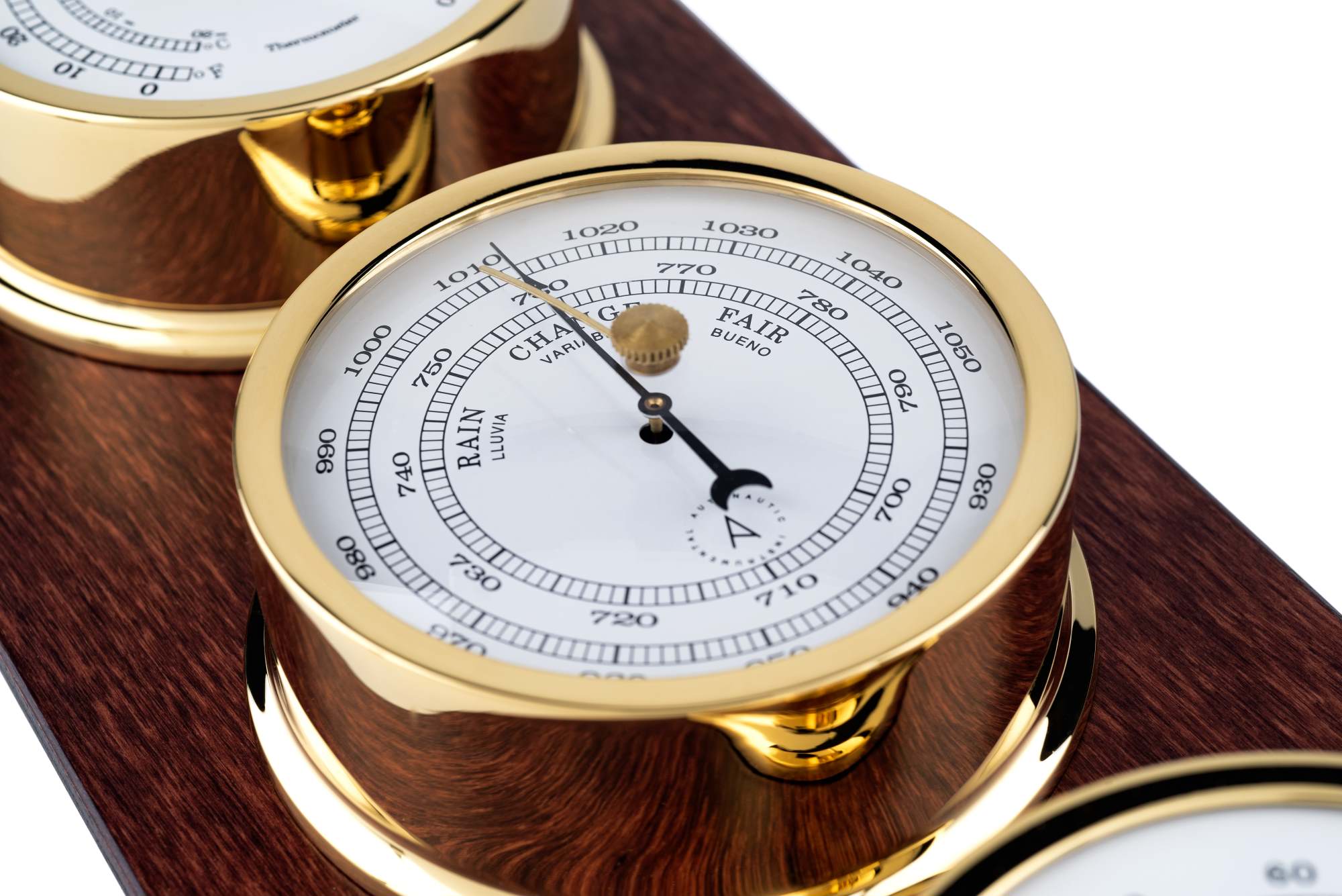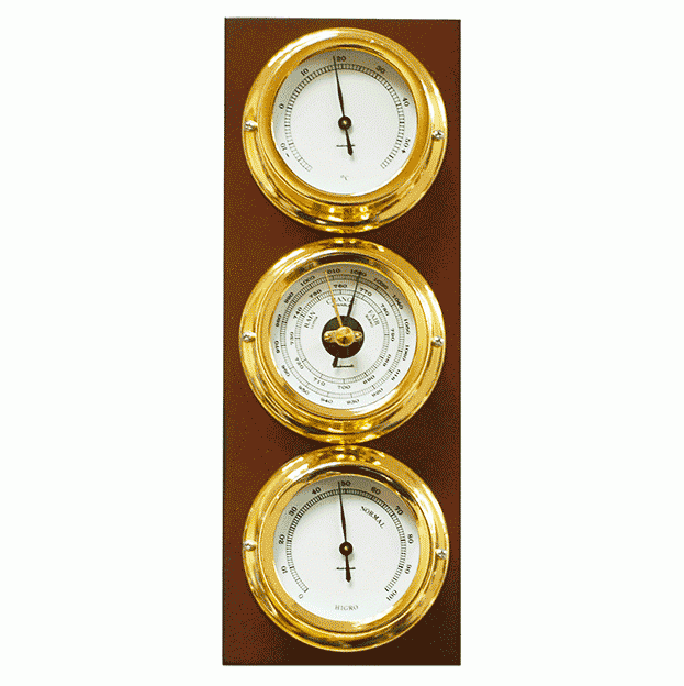 Con la base vetical, montada con termómetro, barómetro e higrómetro.