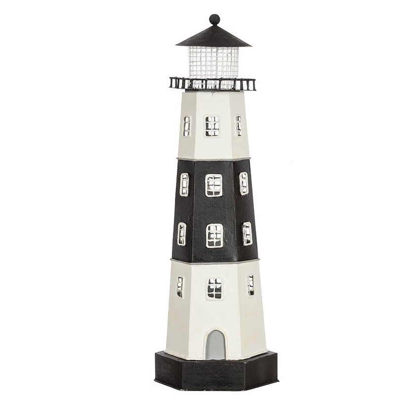 Lámpara eléctrica en forma de faro realizada en hojalata.