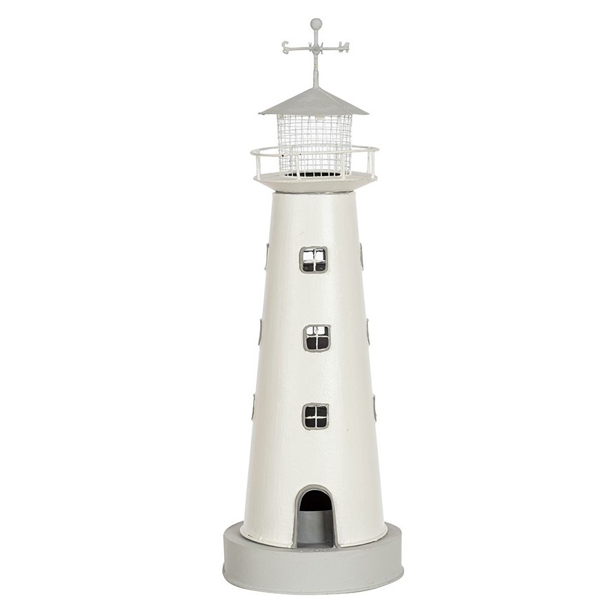Lámpara eléctrica en forma de faro realizada en hojalata.