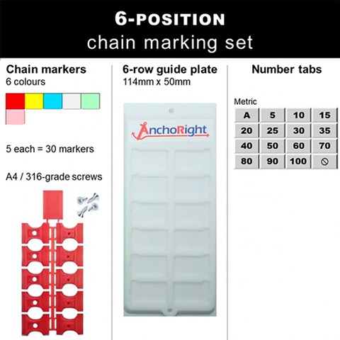 Se sirve en packs que se componen de 6 marcadores de 5 colores distintos (30 uds en total) con su tornilleria en inox A4 y una tabla para memorizar facilmente las diferentes medidas.
