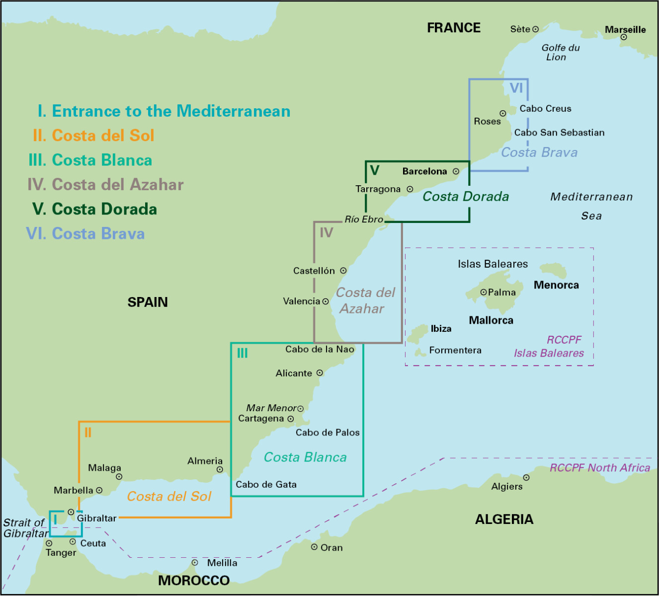This new volume replaces the previous two part coverage of the Mediterranean mainland coast of Spain from Gibraltar to the French border.