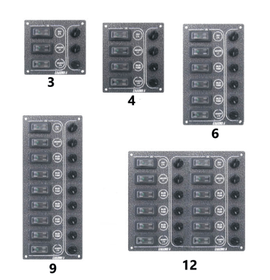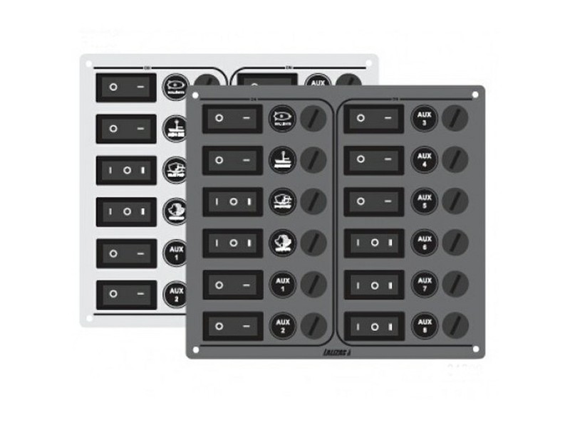 12 interruptores: 7x ON-OFF, 2x ON-OFF-MON, 2x ON-OFF-ON, 1x MON-OFF-MON….180 x 165 mm