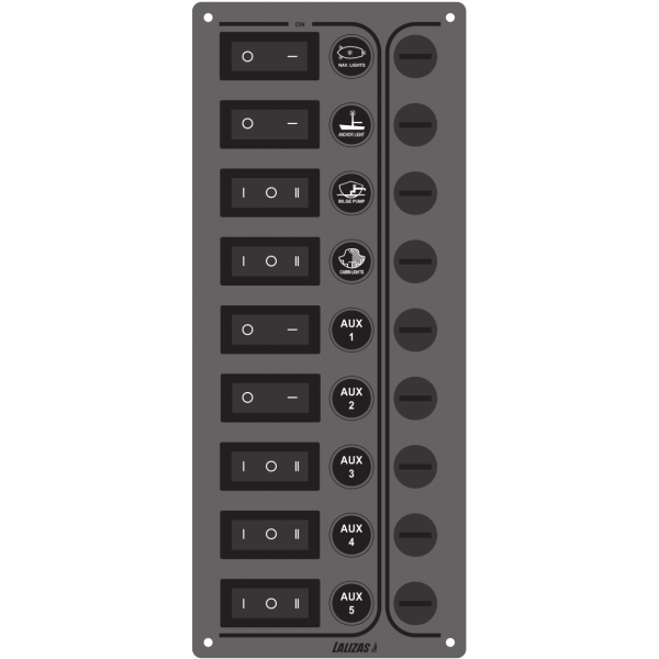 .9 interruptores: 4x ON-OFF, 2x ON-OFF-MON, 2x ON-OFF-ON, 1x MON-OFF-MON….240 x 100 mm