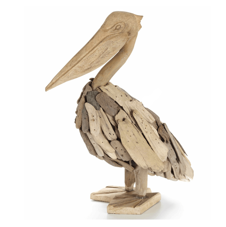 Divertido pelicano decorativo realizado con trocitos de madera flotante,