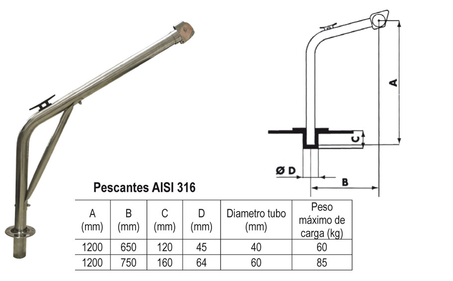 Pescante inox 316- para carga 60 ó 85 kgs