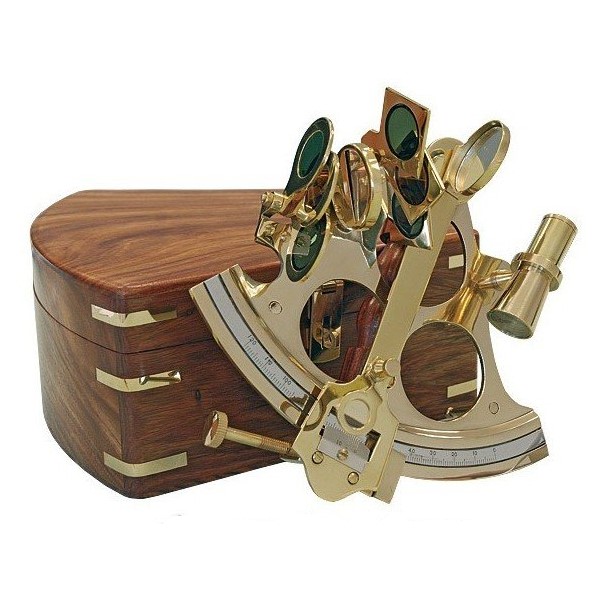 Sextante en latón con una caja en madera de palisandro elegantemente decorada con incrustaciones en latón.