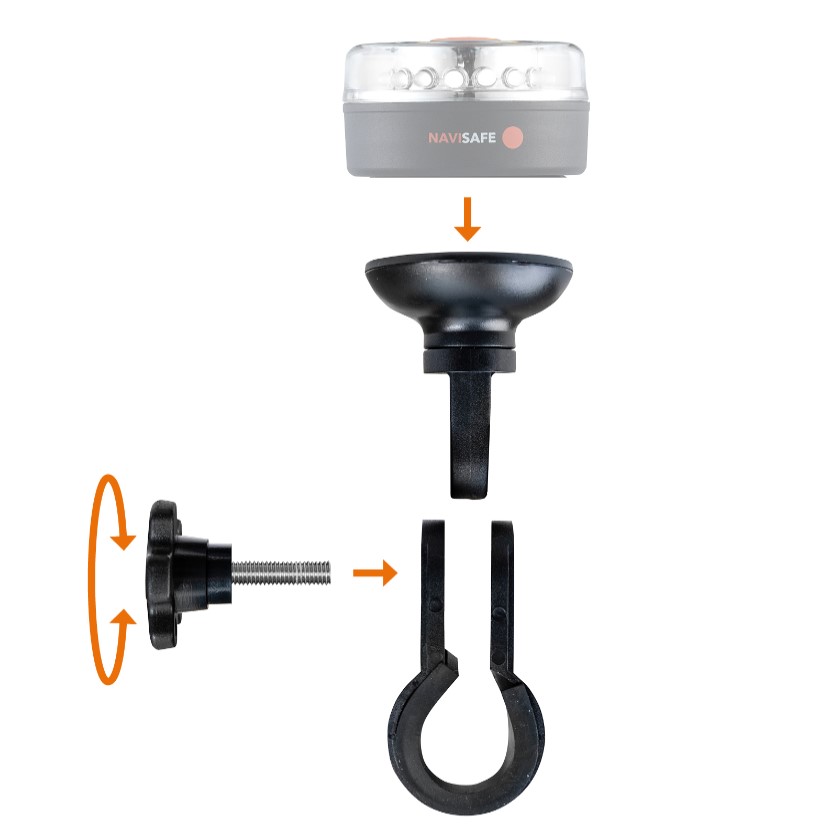 El soporte de riel con abrazadera se fija fácilmente al púlpito de proa y puede sujetar de forma segura una luz Navi TriColor (NS305), por ejemplo. Móntelo centrado en su embarcación y use el modo BiColor.
