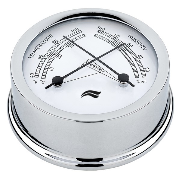 El termohigrómetro de latón cromado con dial de 95 mm está diseñado para medir con