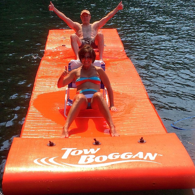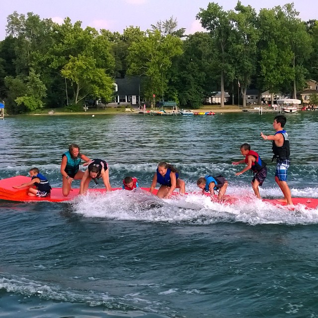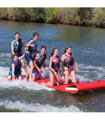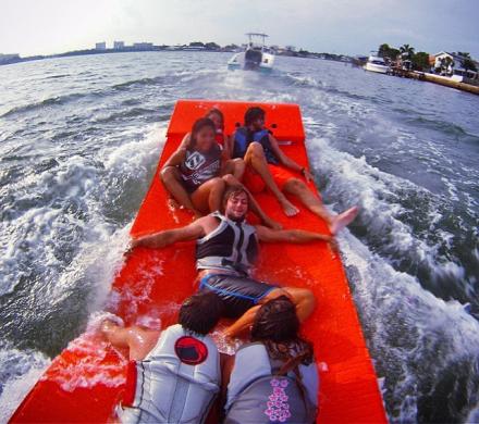 simplemente tira la estera de agua TowBoggan al agua, engánchala al barco y listo.